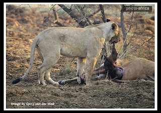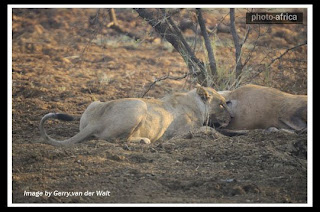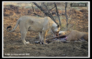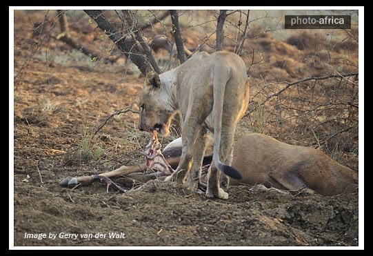 مردن ماده شیر آن هم به این خاطر خیلی برایم عجیب بود، هر چند کل این داستان عجیب و تکان دهنده بود. این بود که به دنبال یافتن منبع اصلی تصاویر گشتم و تقریبا بلافاصله با وبسایت آقای Grey van der walt برخورد کردم، منبع اصلی این تصاویر تکان دهنده. اما در منبع اصلی خبری از مردن ماده شیر نبود. این شد که ایمیلی به ایشان نوشتم و از خود ایشان پرسیدم. جالب است که قبل از این خیلی های دیگر نیز در وبلاگ هایشان و یا وب سایت هایی که در مورد این تصاویر مطلبی نوشته اند مدعی شده اند آن ماده شیر پس از کمک به بچه آن بز کوهی می میرد! اما طبق جوابی که ایشان به من دادند نه تنها آن ماده شیر نمی میرد بلکه هم اکنون صاحب ۵ توله شیر هم هست!
