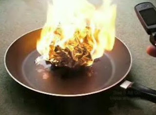 ۱ عدد ماهیتابه، 3 قطعه ی کوچک فلزی مثل شکل، 1ورق فویل، 1عدد موبایل، مقداری نفت یا بنزین